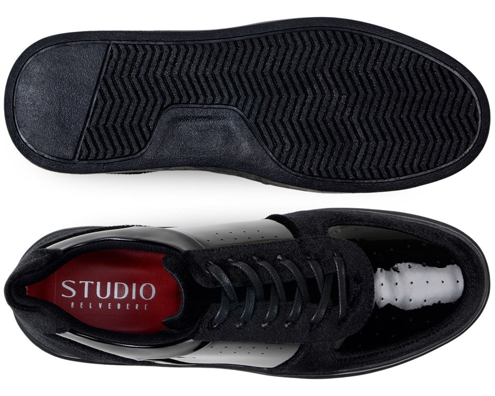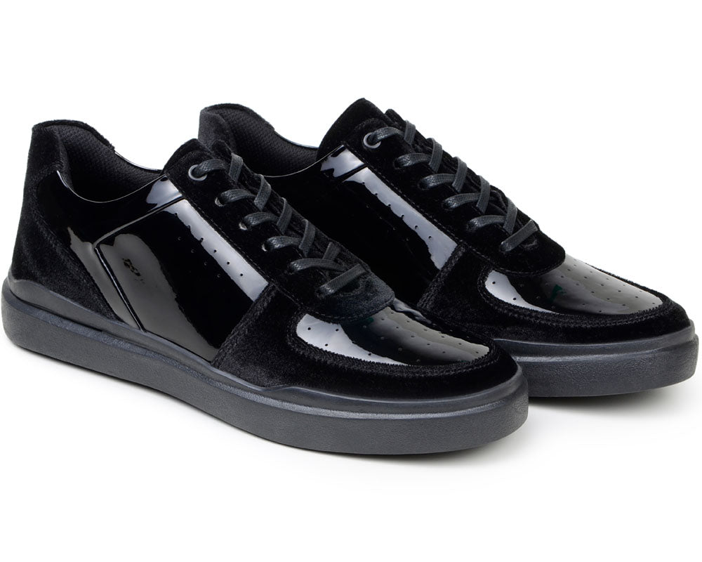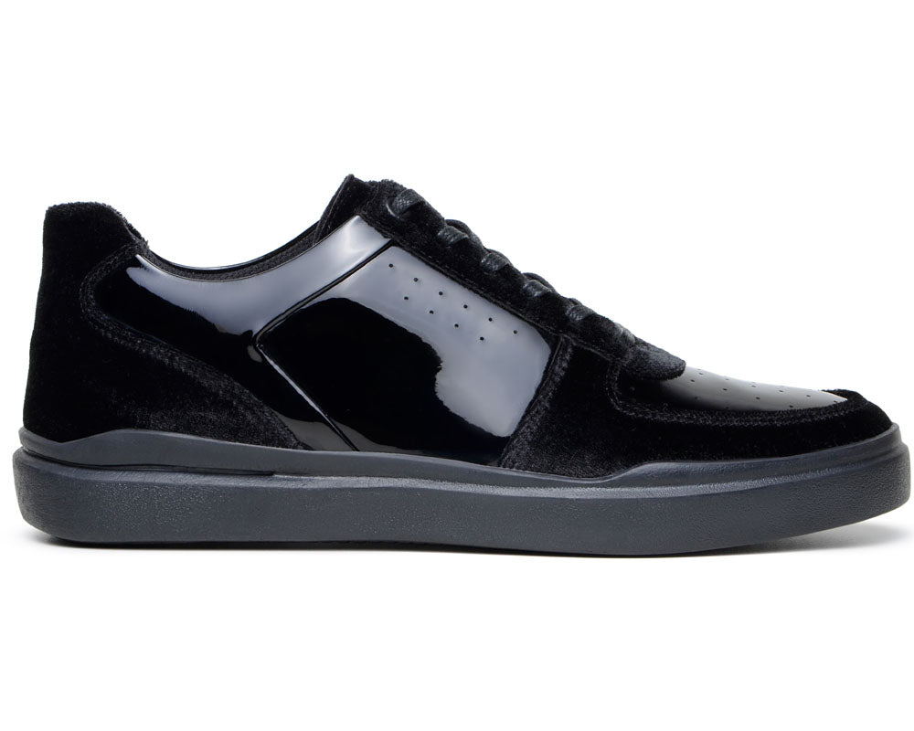 Mixed upper in high-shine patent leather and plush black velvet